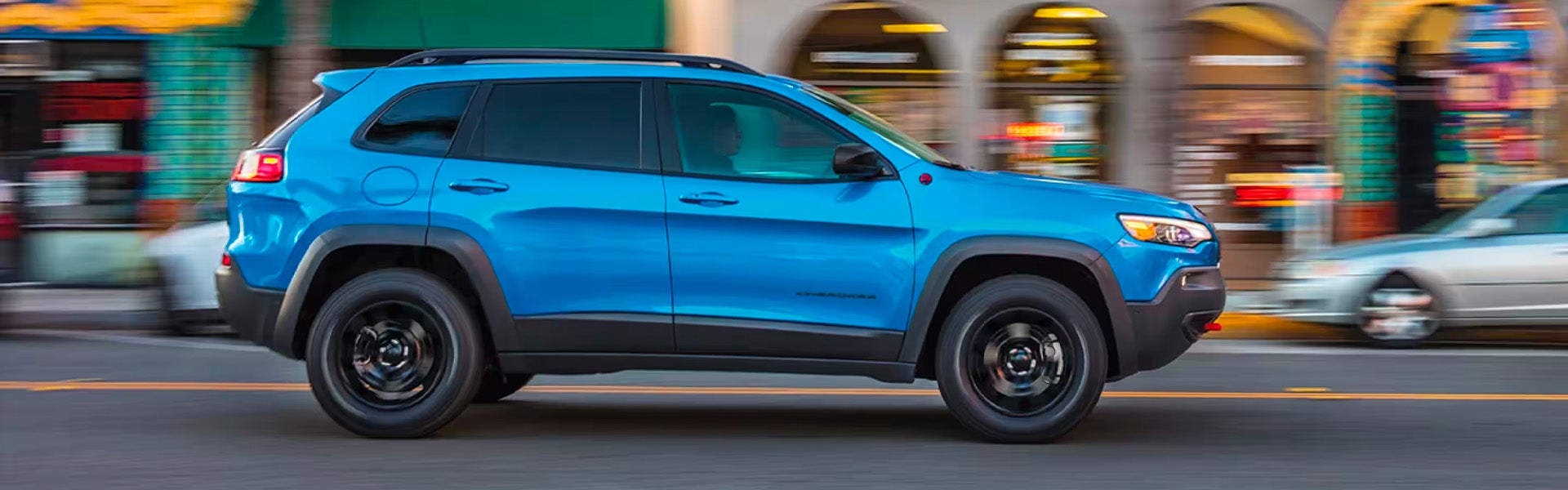 The 2023 Cherokee comes in Trailhawk and Altitude Lux trim levels. Standard exterior features include Jeep's seven-slot grille, a sculpted hood, a rectangular lower grille, fog lights, sculpted sides, automatic LED headlights, heated folding side mirrors, 17-inch wheels, and daytime running lights. Rain-sensing windshield wipers, tinted windows, a rear wiper, a wiper de-icer, roof rails, a rear spoiler, and a power liftgate are standard as well.