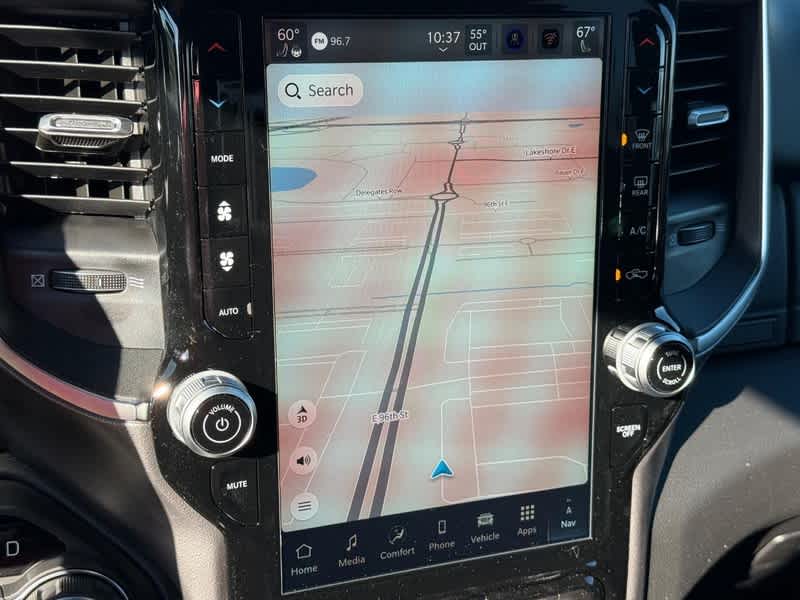 BIG HORN LEVEL 2 EQUIPMENT GROUP SiriusXM Radio Service, Power Adjustable Pedals, Leather Wrapped Steering Wheel, 12 Touchscreen Display, Glove Box Lamp, Auto Power-Folding Mirrors, 115V Auxiliary Rear Power Outlet, Media Hub w/2 Charge Only USBs, Heated Front Seats, Security Alarm, Black Premium Power Mirrors, Premium Overhead Console, 9 Amplified Speakers w/Subwoofer, Disassociated Touchscreen Display, Body Color Fender Flares, Remote Tailgate Release, 115V Auxiliary Power Outlet, LED Dome Lamp w/On/Off Switch, Universal Garage Door Opener, 2nd Row In Floor Storage Bins, Sun Visors w/Illuminated Vanity Mirrors, LED Footwell Lighting, Rear Window Defroster, Rear View Auto Dim Mirror, Rear Power Sliding Window, GPS Navigation, Overhead LED Lamps, Wheels: 20 x 9 Aluminum Chrome Clad, ENGINE: 5.7L V8 HEMI MDS VVT ETORQUE Active Noise Control System, Heavy Duty Engine Cooling, Passive Tuned Mass Damper, GVWR: 7,100 lbs, Dual Rear Exhaust w/Bright Tips, G/T Exhaust, 18 Aluminum Spare Wheel, DUAL-PANE PANORAMIC SUNROOF Dome Dual LED Reading Lamp, NIGHT EDITION Tires: 275/55R20 OWL All Season, Bridgestone Brand Tires, Accent Color Premium Power Mirrors, Exterior Mirrors w/Supplemental Signals, Black Headlamp Bezels, Exterior Mirrors Courtesy Lamps, Grille Black Surround Black Mesh, Auto Power-Folding Mirrors, Wheels: 20 x 9.0 Aluminum Painted Clad, Auto Dim Exterior Driver Mirror, Black Exterior Truck Badging, Anti-Spin Differential Rear Axle, Accent Color Door Handles, Accent Color Tailgate Handle, Black Interior Accents, Dual Exhaust w/Black Tips, Body Color Front Bumper, Body Color Rear Bumper w/Step Pads, Black Tail Lamp Bezels, RAM Grille Badge - Black, Black Painted Exterior Mirrors Caps, SURROUND VIEW CAMERA SYSTEM 12-Way/1-Way Trailer Connector, MOPAR FRONT & REAR RUBBER FLOOR MATS, TRANSMISSION: 8-SPEED AUTOMATIC (8HP75). Ram Big Horn with Bright White Clearcoat exterior and Black interior features a 8 Cylinder Engine with 395 HP at 5600 RPM*.