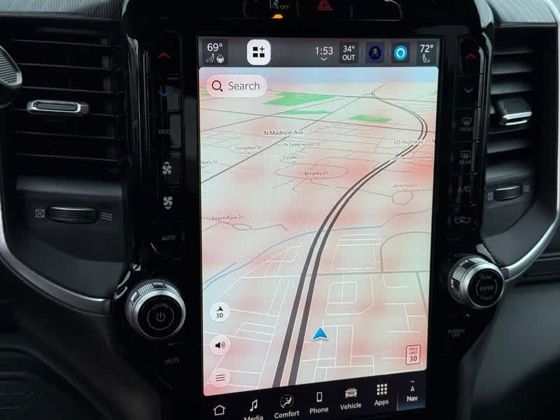 BIG HORN LEVEL 2 PLUS EQUIPMENT GROUP Surround View Camera System, Blind Spot & Cross Path Detection, LED Tail Lamps, Red Tail Lamp Bezels, Power Adjustable Pedals, Emergency Vehicle Alert System (EVAS), 12 Touchscreen Display, Glove Box Lamp, Auto Power-Folding Mirrors, Footwell Courtesy Lamp, 115V Auxiliary Rear Power Outlet, Media Hub w/2 Charge Only USBs, Anti-Spin Differential Rear Axle, Drowsy Driver Detection, Heated Front Seats, MOPAR Deployable Bed Step, Exterior 115V AC Outlet, Alexa Built-In, Active Lane Management System, Forward & Reverse Utility Lights, Locking Lower Glove Box, Remote Start System, 9 Alpine Speakers w/Subwoofer, Disassociated Touchscreen Display, Dual Wireless Charging Pad, Trailer Tire Pressure Monitoring System, Dual Glove Boxes, 115V Auxiliary Front Power, NIGHT EDITION Gloss Black Nostrils/Mic Black Grille, Tires: LT285/60R20E OWL On/Off Road, Black Exterior Truck Badging, Wheels: 20 x 8.0 Black Painted Aluminum, Body Color Grille-Surround, Black Interior Accents, Black Wheel Center Hub, Painted Front Bumper, Painted Rear Bumper, PAINTED FLAT WHEEL-TO-WHEEL SIDE STEPS, MOPAR FRONT & REAR RUBBER FLOOR MATS, BLACK, PREMIUM CLOTH BUCKET SEATS Bucket Seats, Power Adjust 8-Way Driver Seat, Folding Flat Load Floor Storage, Rear 60/40 Folding Seat, Front Seat Back Map Pockets, Power 2-Way Driver Lumbar Adjust, Full Length Upgraded Floor Console, TRANSMISSION: 8-SPEED AUTO (8HP75-LCV) (STD), ENGINE: 6.4L V8 HEMI HD (STD). Ram Big Horn with Diamond Black Crystal Pearlcoat exterior and Black interior features a 8 Cylinder Engine with 405 HP at 5600 RPM*.